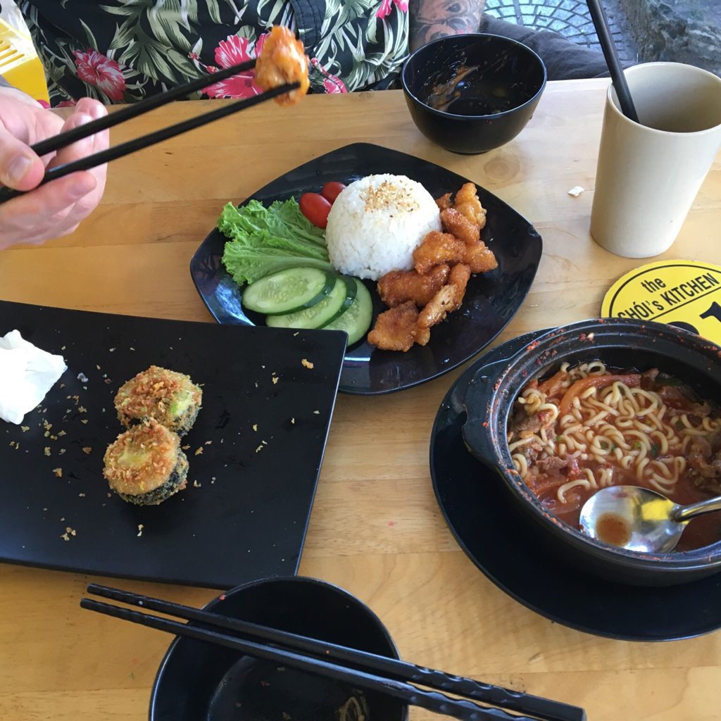 Was also tun? Mitten an der Straßenkreuzung nahezu zwischen hupenden und stinkenden Mopeds und Autos was essen.