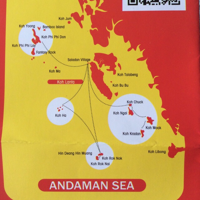 Also: gestartet sind wir in Krabi – das befindet sich oben ausserhalb der Karte und gehört zum thailändischen Festland. Von da ging es mit Fähre erstmal nach Koh Jum (die oberste beschriftete Insel). Dann weiter nach Koh Lanta – das ist die lange Insel in der Mitte. Dort waren wir an der Westküste ungefähr mittig am Khlong Kong Beach. Angekommen sind wir ganz im Norden am Saladan Pier – abgefahren sind wir im Süden auf der Ostseite ( da wo die unbeschriftete Insel unter Koh Bu Bu liegt). Und seit heute sind wir auf Koh Ngai – also südwestlich von Koh Lanta.