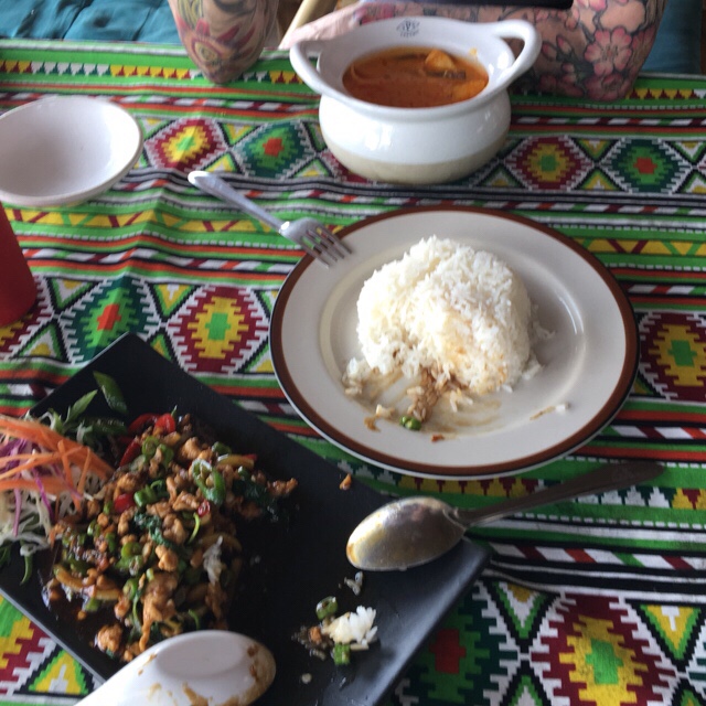 Und natürlich auch direkt mal das Restaurant hier getestet. Massaman Curry für Nette und Pad Krapong (Scharfer Thaibasil) mit Hühnchen – sehr, sehr lecker.