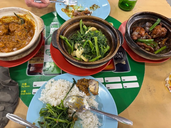 Neben Reis und Wasserspinat haben wir uns zwei Varianten Hähnchen gekauft – alles im Claypot gebrutzelt. Wirklich richtig lecker das Ganze und von einer freundlichen chinesischen Oma und vermutlich ihrem Sohn (oder Enkel?) serviert.