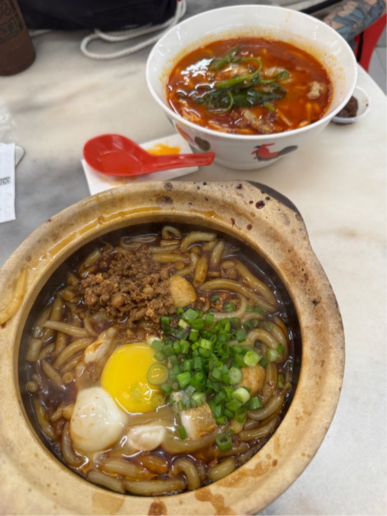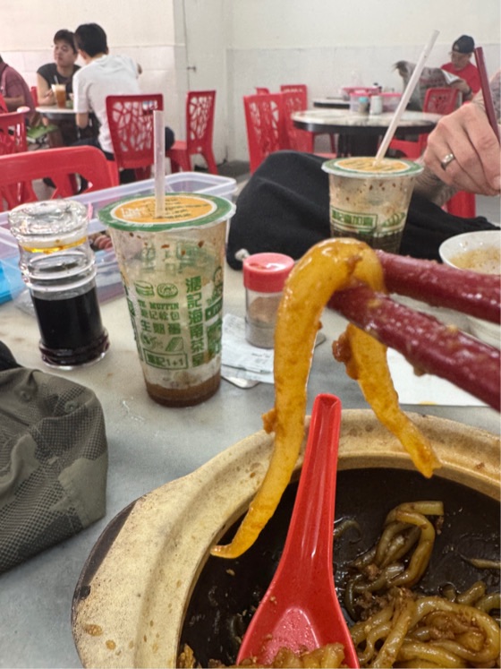 Nette hat sich – neben dem Kaffee – für ein scharfes Süppchen entschieden. Für mich gab es Rattenschwanz-Nudeln im Tontopf. Der Name (Lo Shi Fan) kommt von der Form, die die Nudeln haben – hoffe ich zumindest.