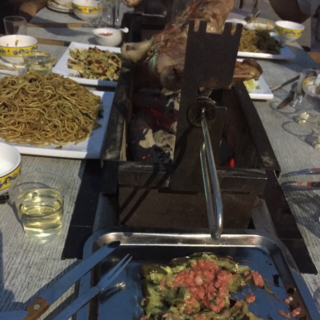 Vorne Aubergine, dahinter Lammkeule, direkt am Tisch gegrillt. Dazu Nudeln, Pommes ala China und Lotusirgendwat. Sehr lecker!