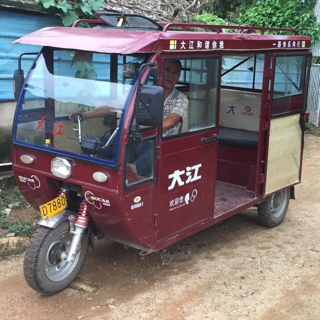 Das dreibeinige Gefährt dient sonst zur Heimfahrt von Sandao zur Schule. Aber da ich heute mit dem Schulroller unterwegs bin: kein Bedarf.