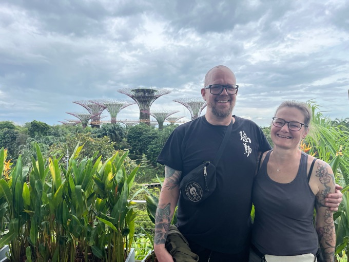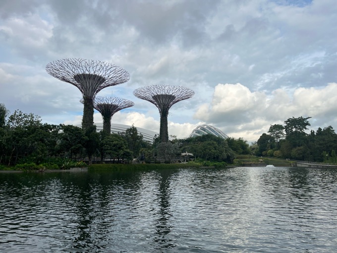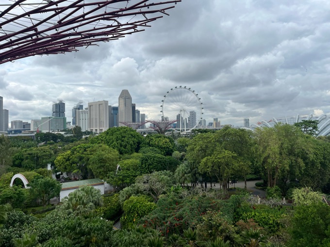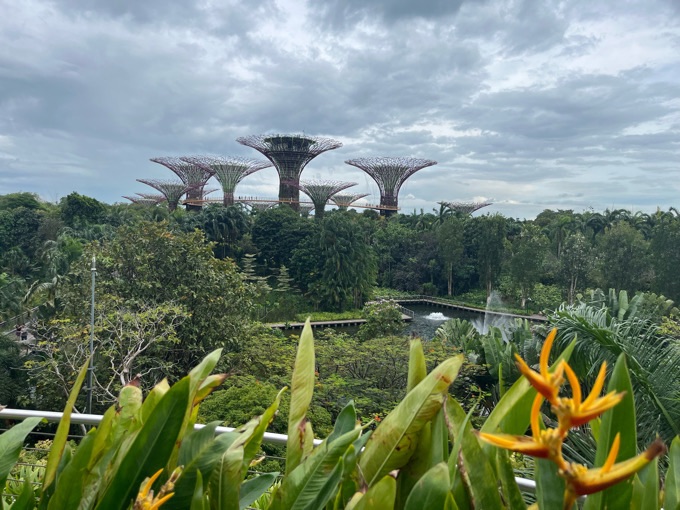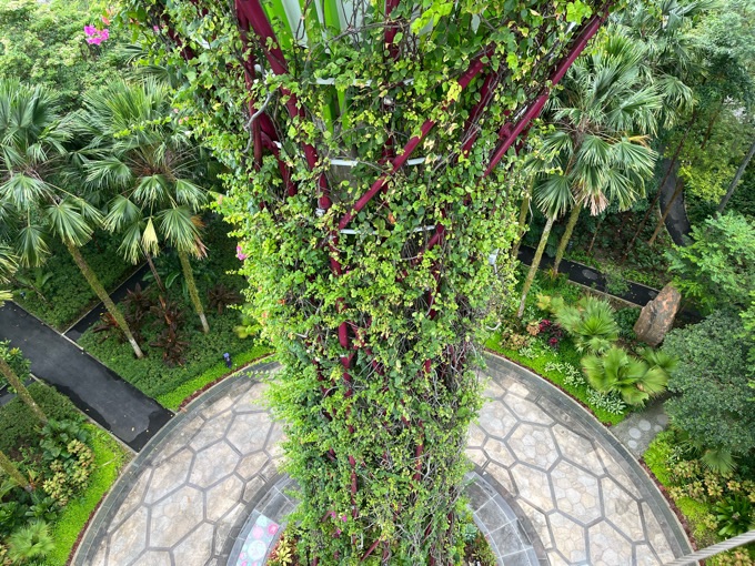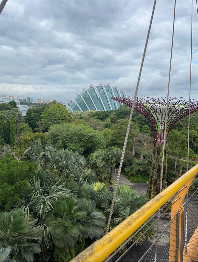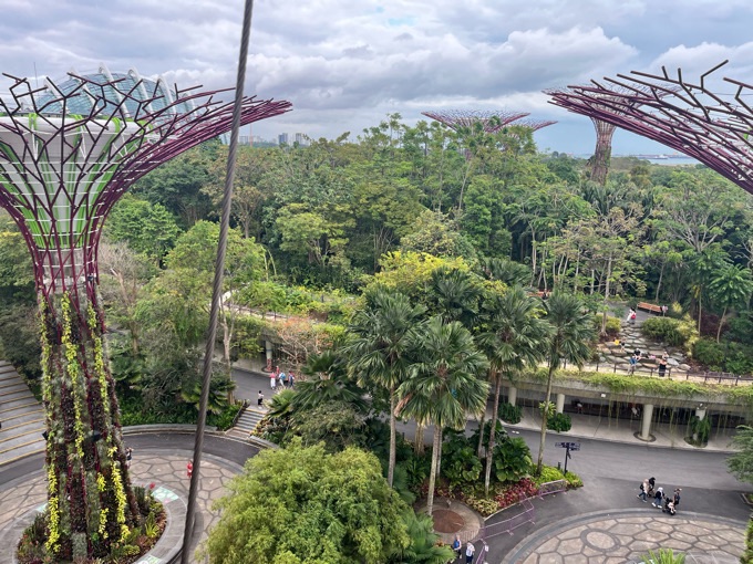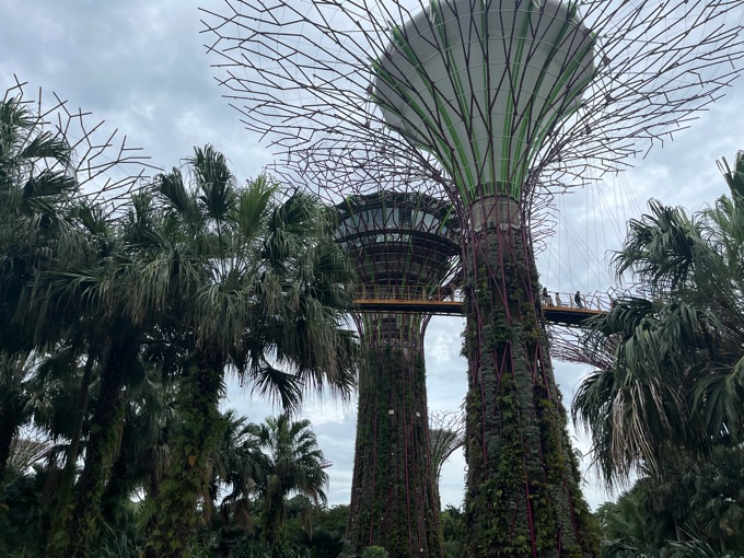 Vom Rooftop sind wir dann noch mal rüber zu Gardens by the bay – wo wir ja gestern Abend schon zur Lichtshow waren. Wir wollten uns das ganze noch mal Tageslicht anschauen. Wie man hier sieht – ebenfalls ein sehr beeindruckendes Projekt aus Singapur. Diese künstlichen Bäume sind eine Konstruktion, die mit Rankpflanzen bewachsen sind. Und zudem kann man oben auf einem Skyway in 22 Metern Höhe entlanglaufen.