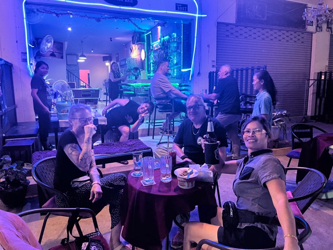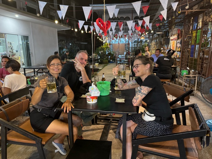 Nach einigen Runden Singha Bier hätten wir mit der ganzen Truppe noch weiterziehen können. Da es aber schon 23:30 war und wir ja am nächsten Tag nach Laos müssen, haben wir darauf verzichtet – vermutlich wird der morgen eh schon zäh. Aber es hat sich gelohnt und richtig Spaß gemacht.