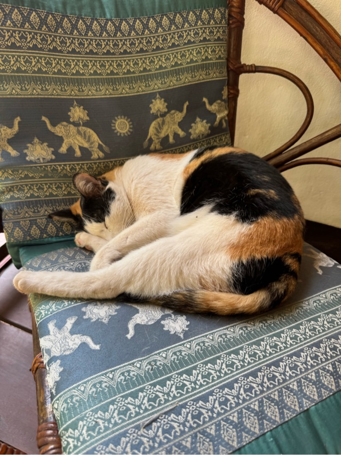 Und eine Hauskatze scheint zum gebuchten Paket auch dazu zu gehören. Die hat es sich auf einem der Stühle auf unserer Veranda gemütlich gemacht.