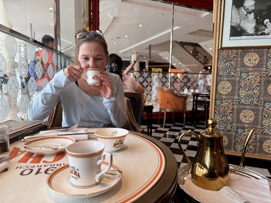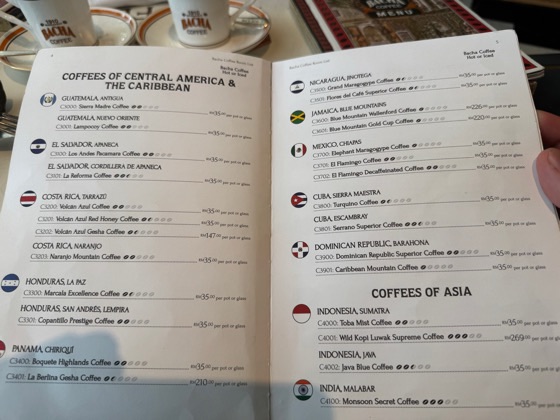 Neben dem wirklich schicken – zugegebenermaßen aber auch kolonialem Ambiente – bekommthat man hier eine unfassbare Auswahl an unterschiedlichen Kaffees. Und damit meine ich nicht Espresso, Latte usw. Nein, gemeint sind verschiedenen Bohnen aus aller Welt – unter anderem auch der Kopi Luwak, der einmal durch den Darm einer Wildkatze gewandert ist. Darauf haben wir allerdings verzichtet, da er pro Kanne über 50 Euro kosten sollte – außerdem schmeckt der bestimmt Scheisse