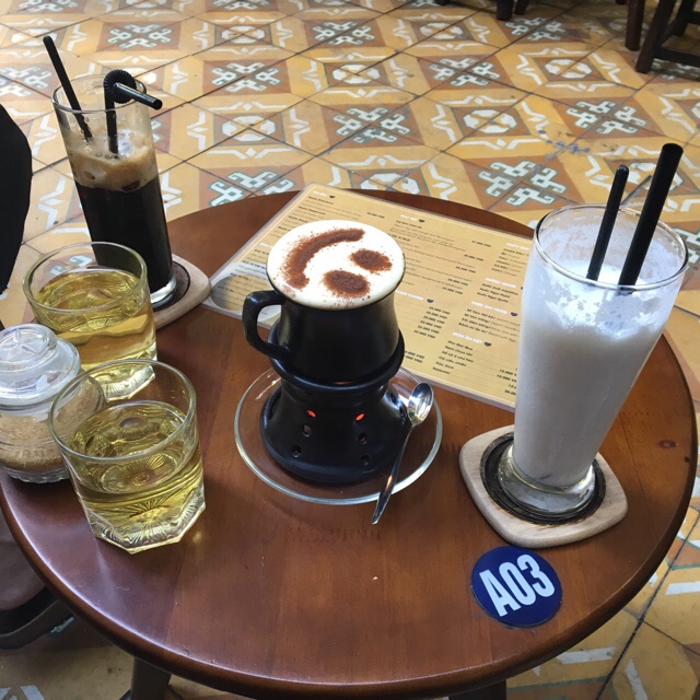 Da die Verspätung inzwischen bei 2,5 Stunden liegt, haben wir natürlich noch ordentlich Zeit bis es losgeht. Deshalb erstmal ins nächste Kaffee und ne Rutsche Getränke bestellt: Eiskaffee, Kokosnuss-Smoothie, einen Eier-Kaffee und auf Haus noch zwei Gläser mit grünem Tee (das hoffe ich zumindest – geschmacklich könnte es auch Spülmittel sein und dem Händewaschen dienen)