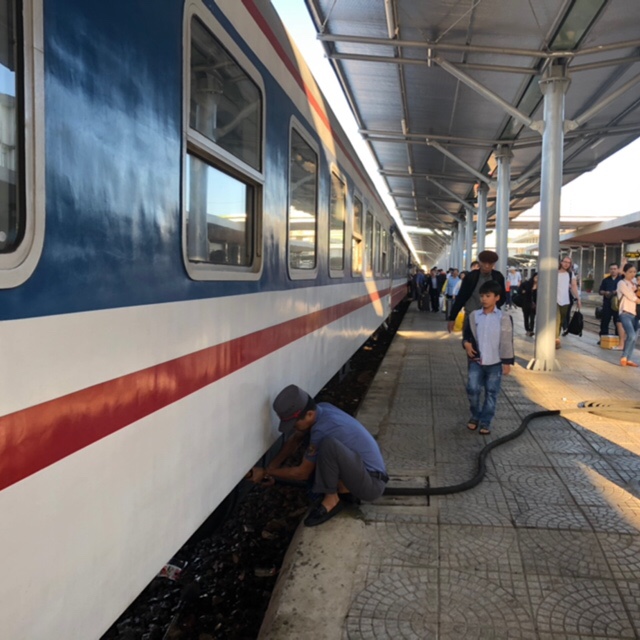 Mit gut drei Stunden Verspätung sind wir gestern in Da Nang losgefahren. Leichte Tumulte beim Einstieg, da die Abteile 12 und 12A fehlten – diese wurden im Bahnhof erst angehängt. Wir hatten ein Vierer-Schlafabteil im Voraus gebucht, da alles andere schon weg war. Zugfahrten in Vietnam – besonders um das Neujahrsfest TET herum – sollten auf jeden Fall vorher gebucht werden. Geht auch online sehr einfach unter baolau.com